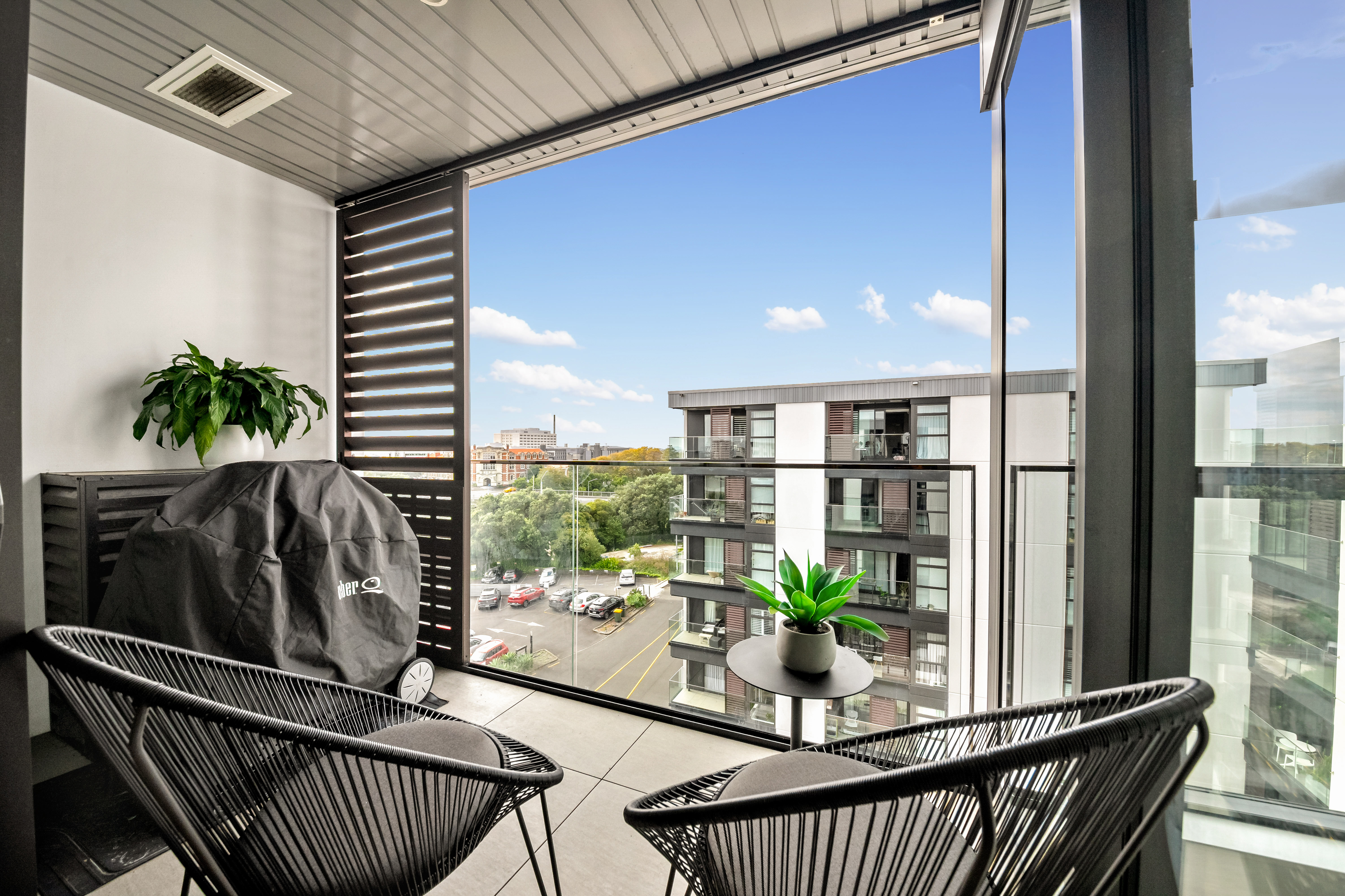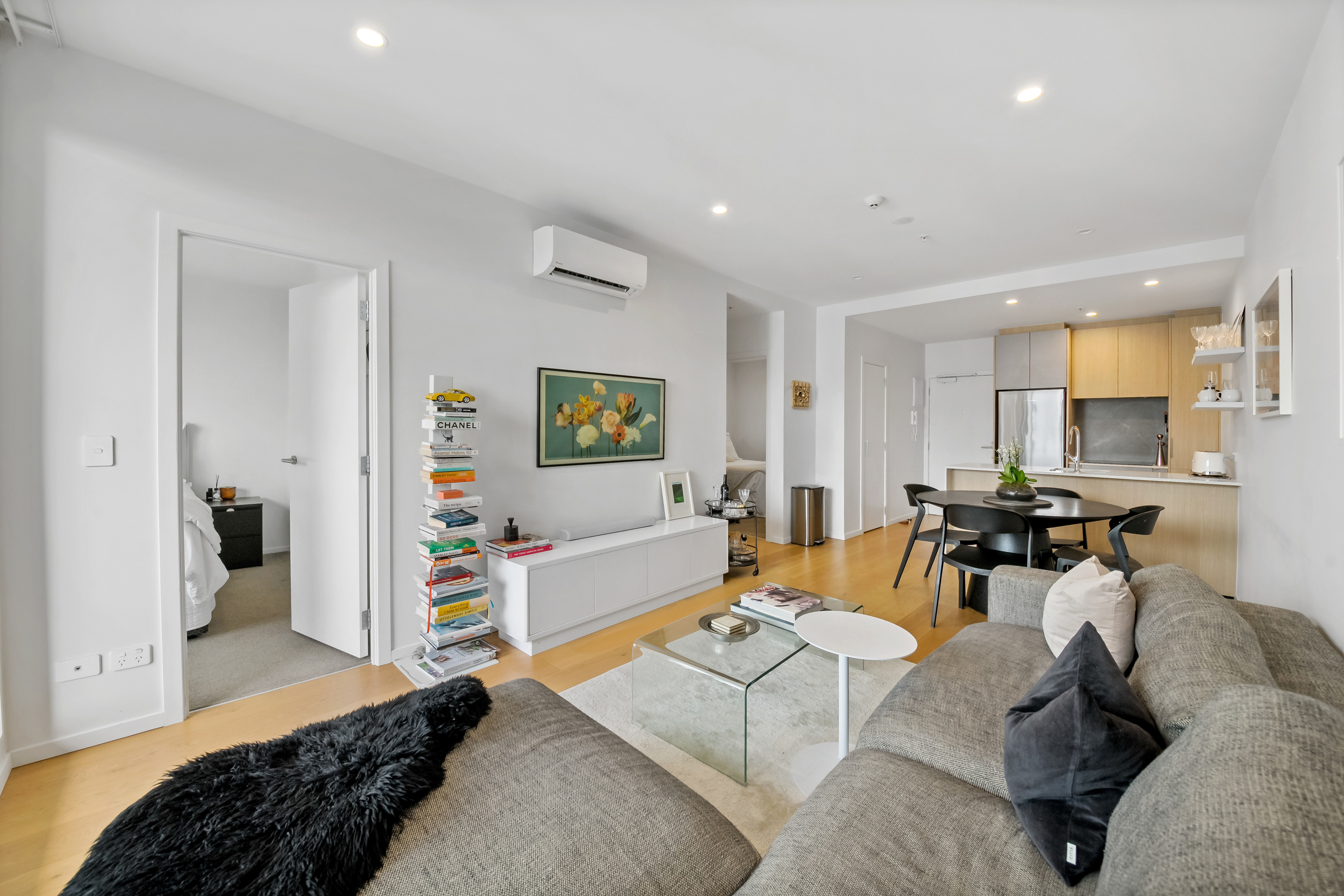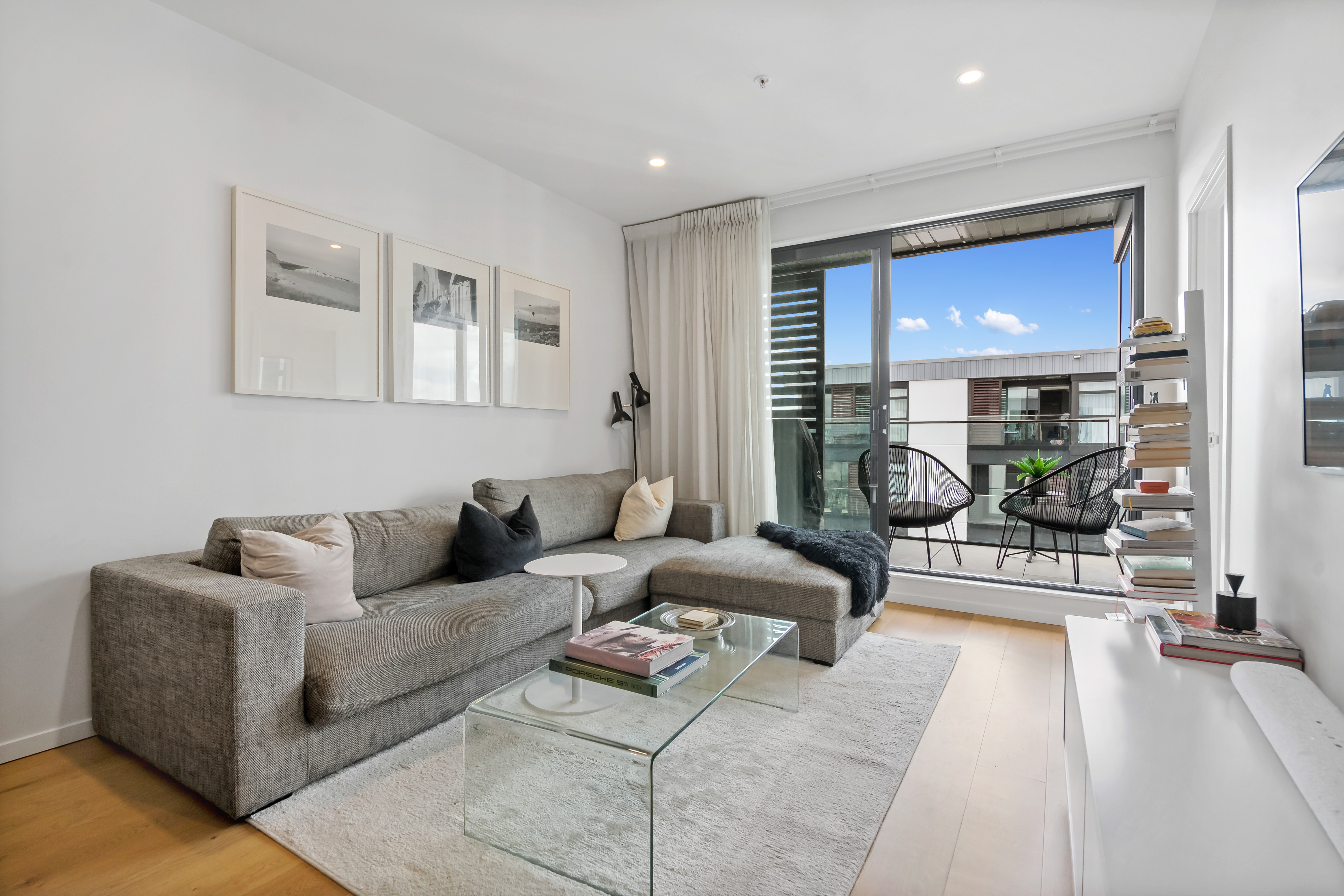This sophisticated top-floor residence offers a seamless blend of luxury and lifestyle, where a meticulous 64 sqm (more or less) floor plan is defined by a remarkable sense of volume. High ceilings and rich timber flooring lead you naturally toward a 6 sqm covered balcony, a vantage point that treats you to unobstructed views of Rangitoto-an iconic backdrop that transforms beautifully with the light of the day.