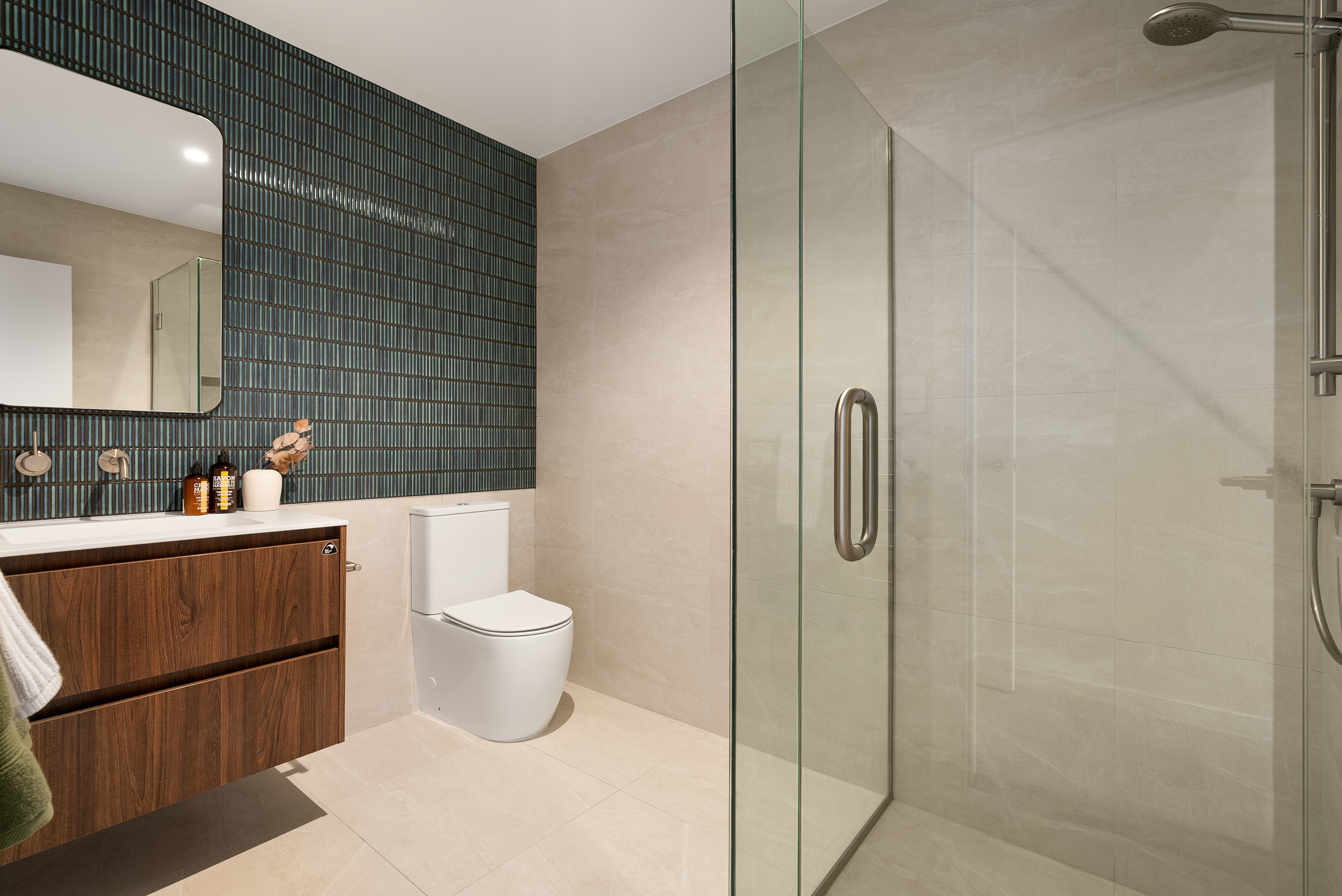 The top floor hosts the private primary suite, featuring a spacious bedroom, a generous built-in wardrobe, and a stylish tiled ensuite. A second bedroom on this level offers further accommodation for family, flatmates, or visitors, each enjoying excellent natural light and separation from the main living zones.