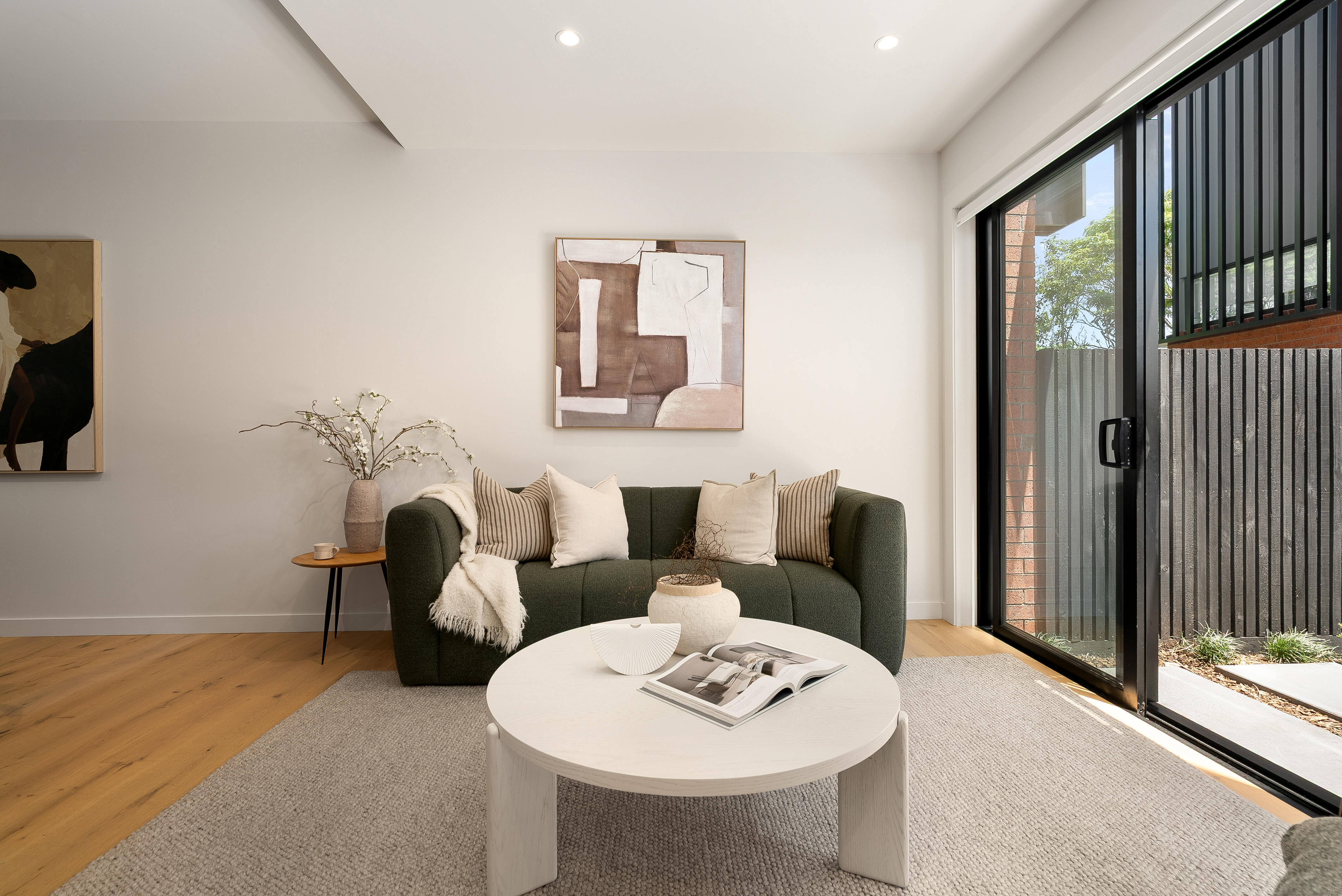 On the second level, a well-proportioned bedroom with a built-in wardrobe is accompanied by a centrally located bathroom and a cleverly positioned laundry. A second living area on this floor enhances versatility, making it perfect for a home office, media room, or relaxed retreat for guests or teens.