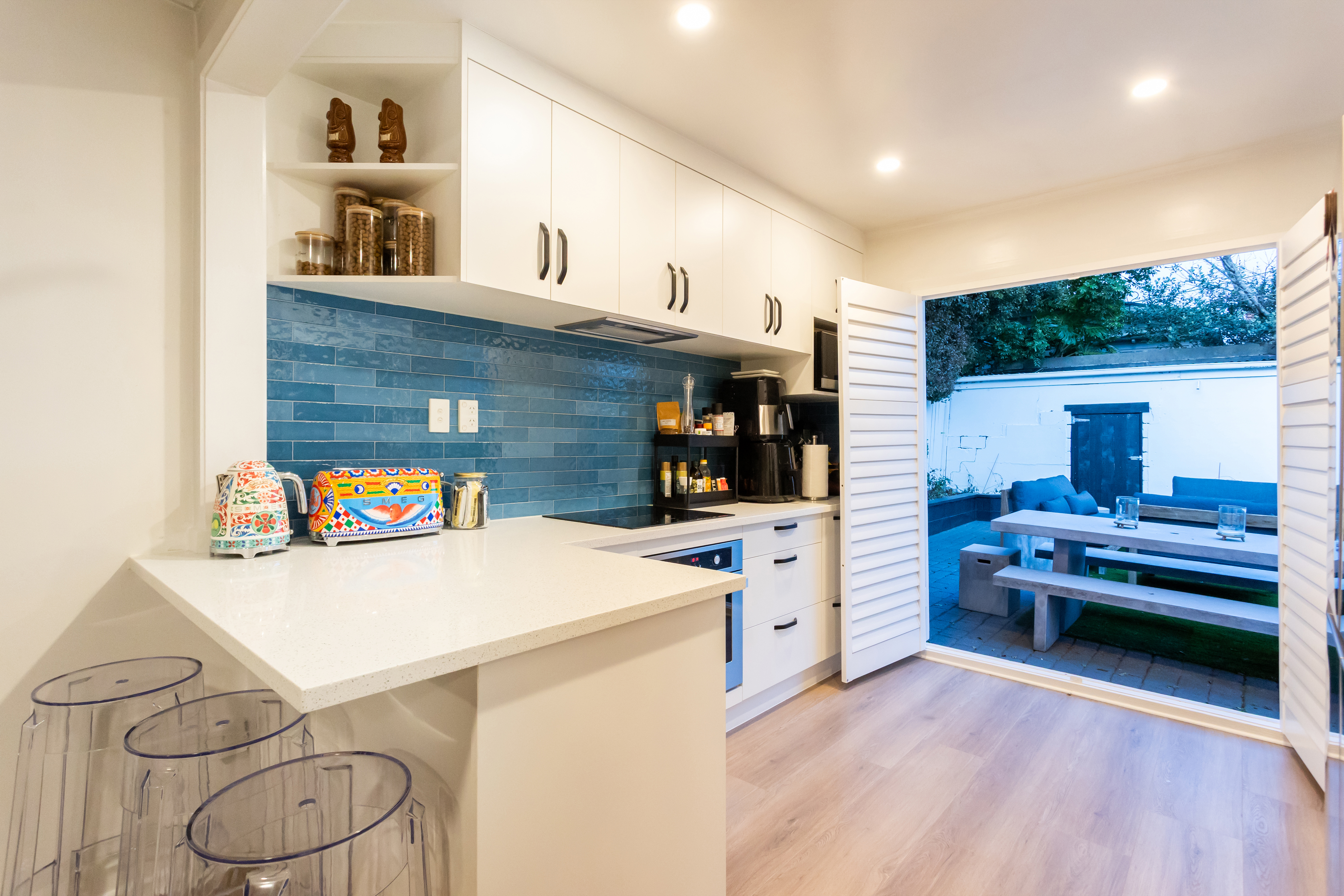 The open-plan kitchen and dining area flow effortlessly to a sun-soaked, north-facing courtyard and garden, an ideal setting for long afternoons with friends.