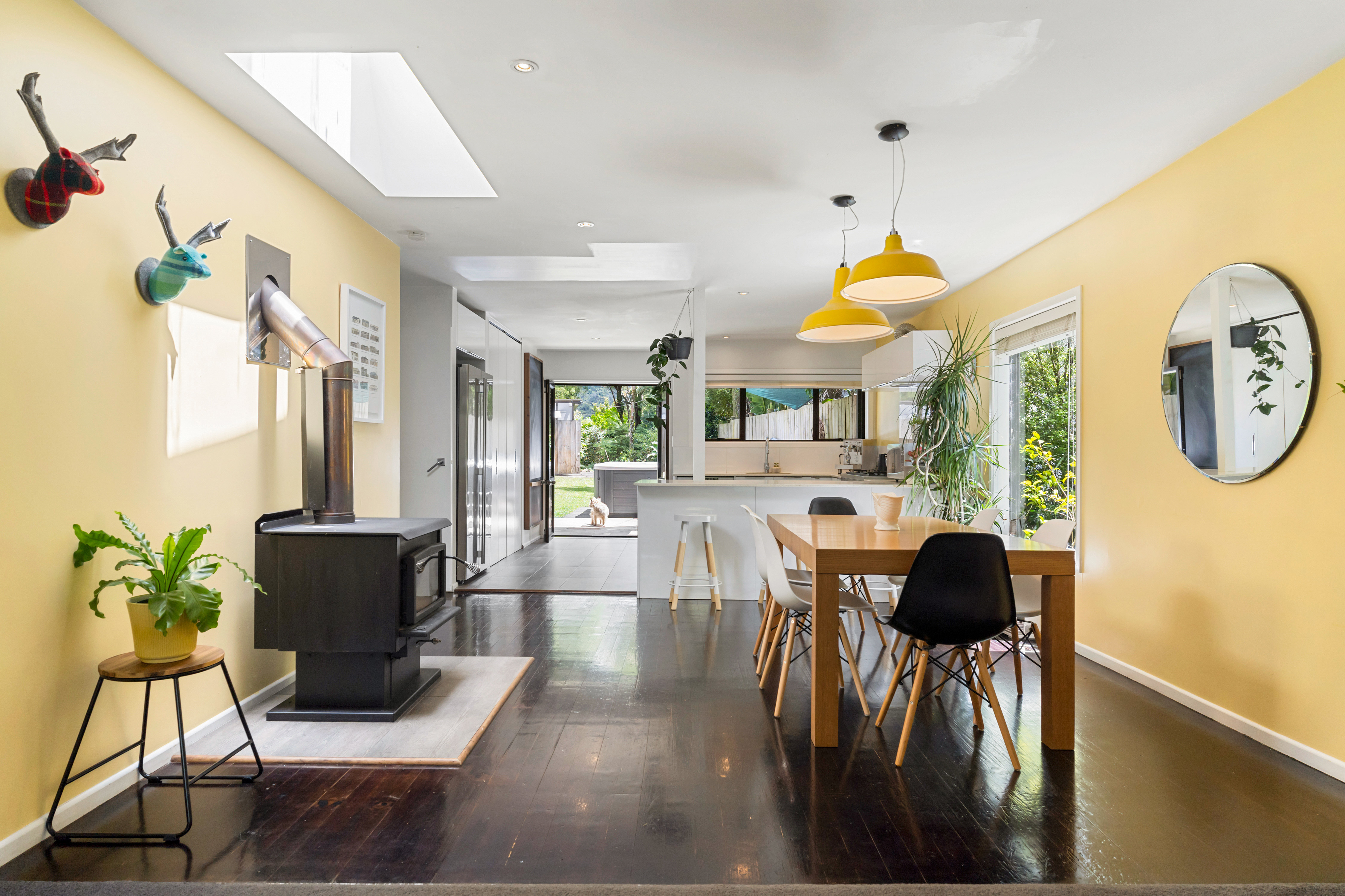 The heart of the home is the light and bright main level, featuring a large, contemporary open-plan living space. A modern kitchen flows seamlessly into the dining and living area, offering year round comfort with a fireplace and gas heating. This space opens to decking at the front and a flat, sun drenched backyard - perfect for children and entertaining. Three bedrooms, a family bathroom, and a tucked away laundry also reside on this level.