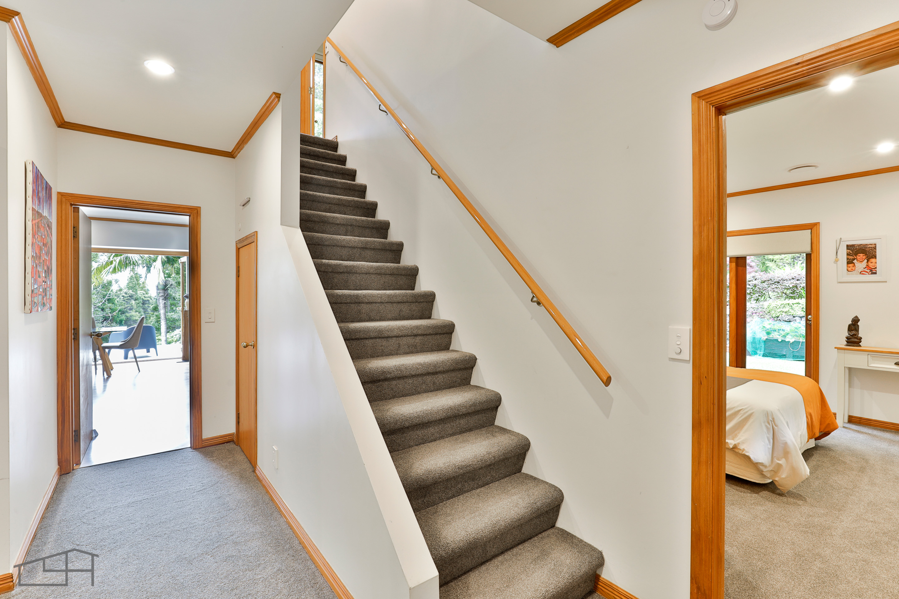 Upstairs a semi-ensuite accompanies the master bedroom, where a private balcony takes in the views across the treetops to the city and harbour. There is a walk through wardrobe and storage corridor. The additional three bedrooms offer a variety of benefits, from wide concertina windows and a second balconette, to a quiet lower level room with external access. All serviced by the full family bathroom (part ensuite) upstairs and a second bathroom with shower on the lower level.