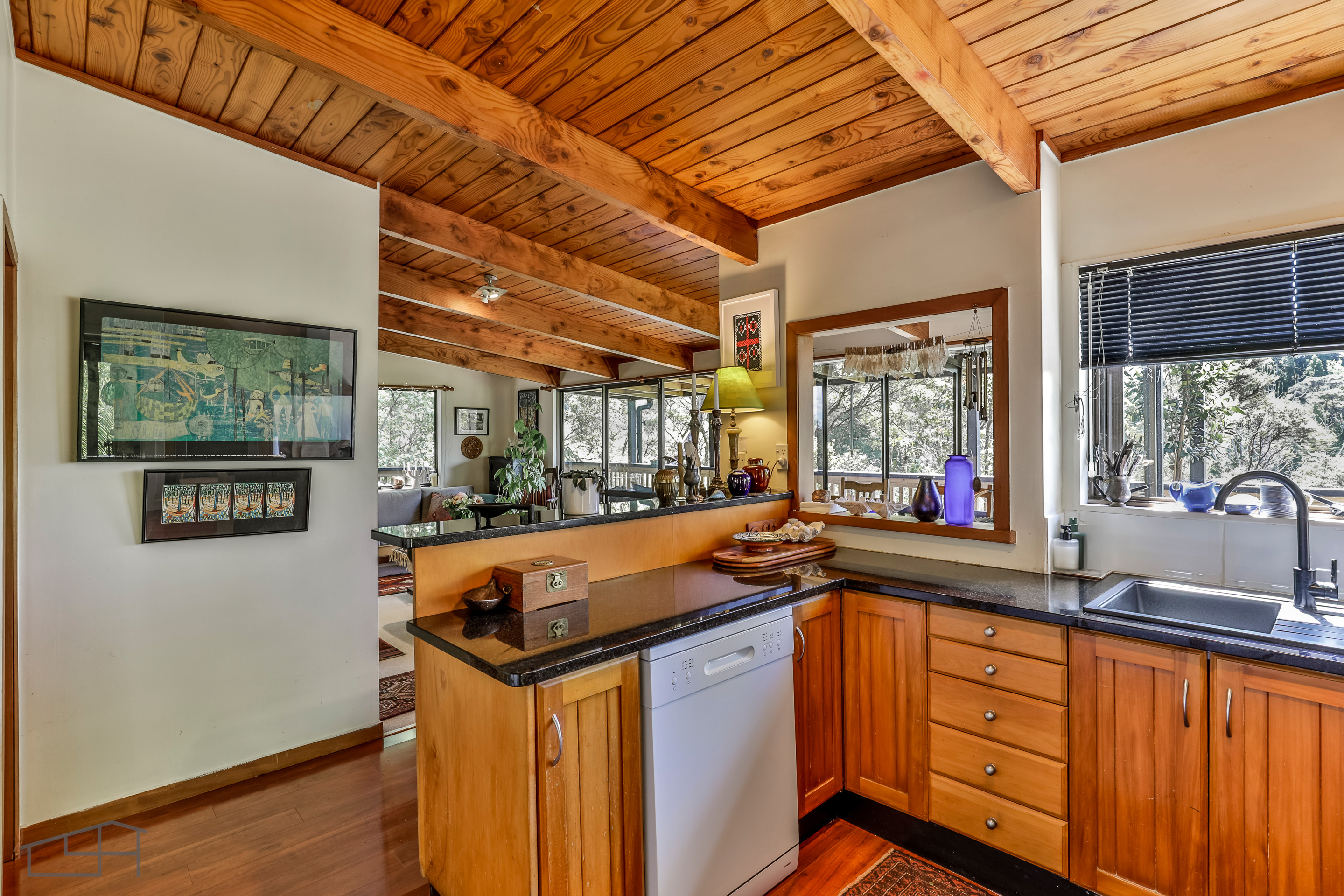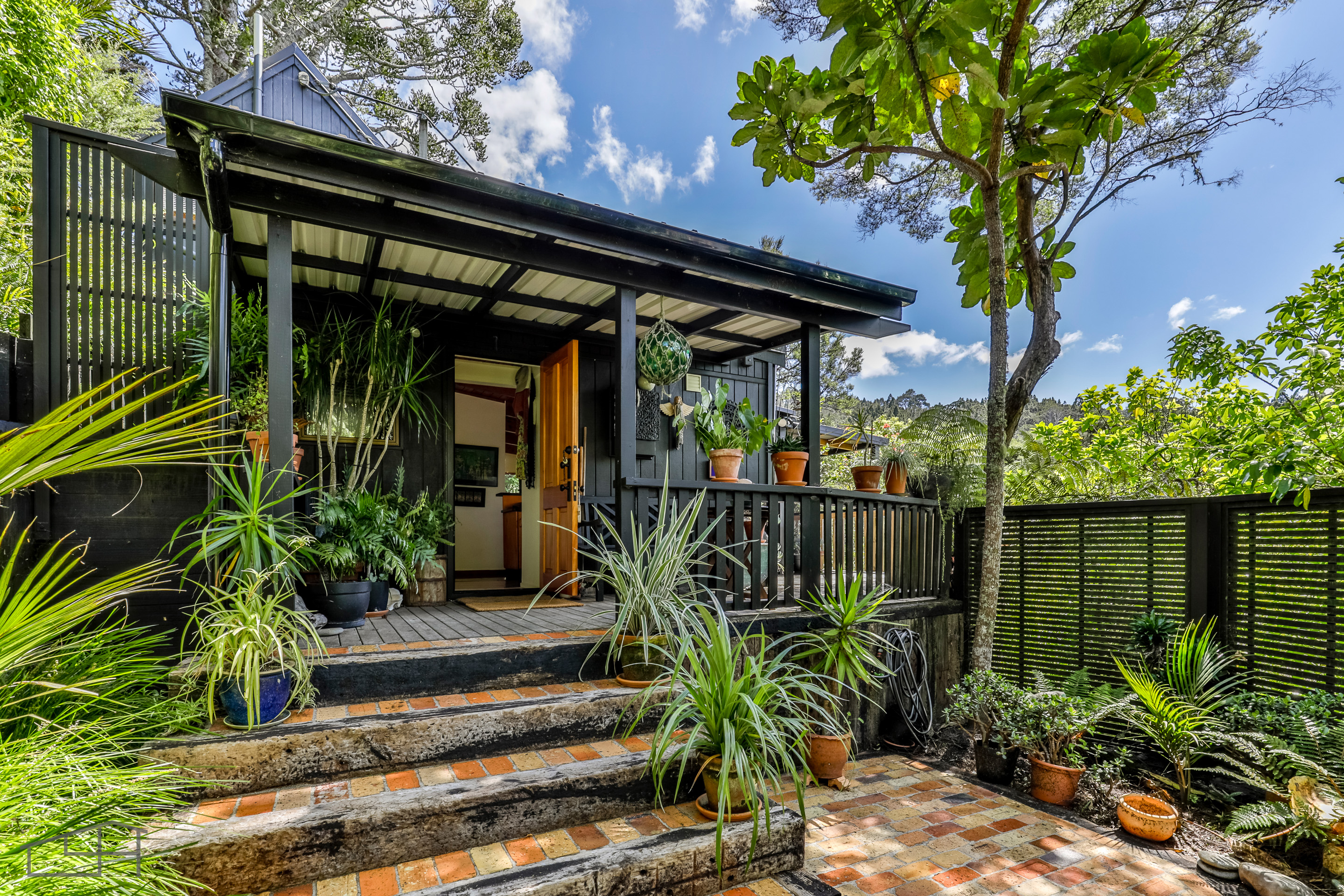 Bathed in sun with sweeping sea and native bush views, it features open-plan living with a wood fire, two heat pumps, a granite and timber kitchen, with glass doors that open outward to a covered deck, extending the living space to the outdoors. A charming, landscaped entrance with a bricked pathway leads to the front door, setting a warm and welcoming tone from the moment you arrive.