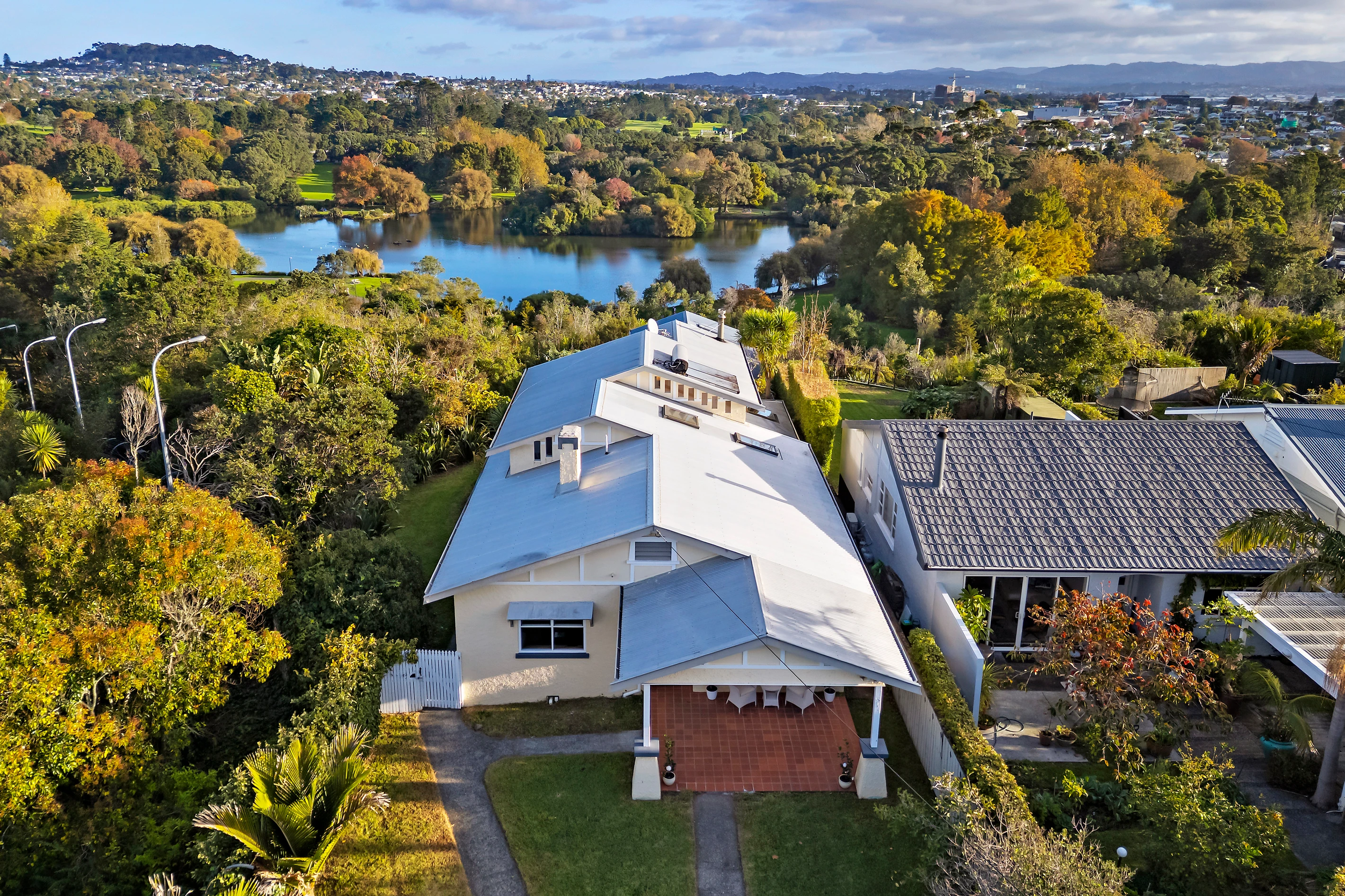 The open-plan living and dining area flows out to a deck and garden with views of Western Springs Lake and spectacular sunsets. The large kitchen includes two walk-in pantries, which could be converted into a scullery.