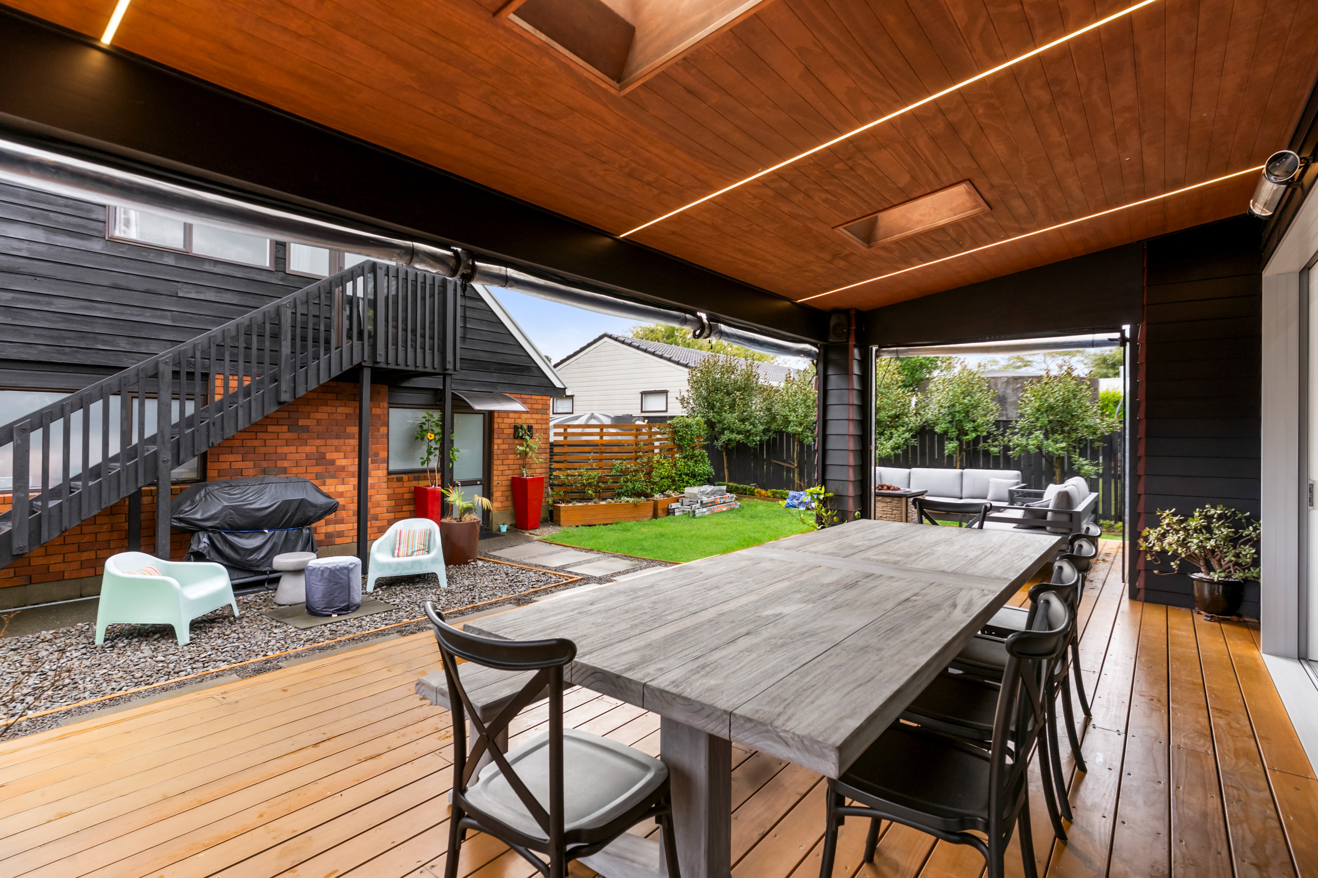 Set apart, the minor dwelling introduces a different tone entirely. Modern, high-spec, and self-contained, it offers two bedrooms and two bathrooms, with its own covered outdoor living and gated parking. Private, refined, and complete in its own right, it functions as a home within the property, ideal for extended family or a possible premium rental.