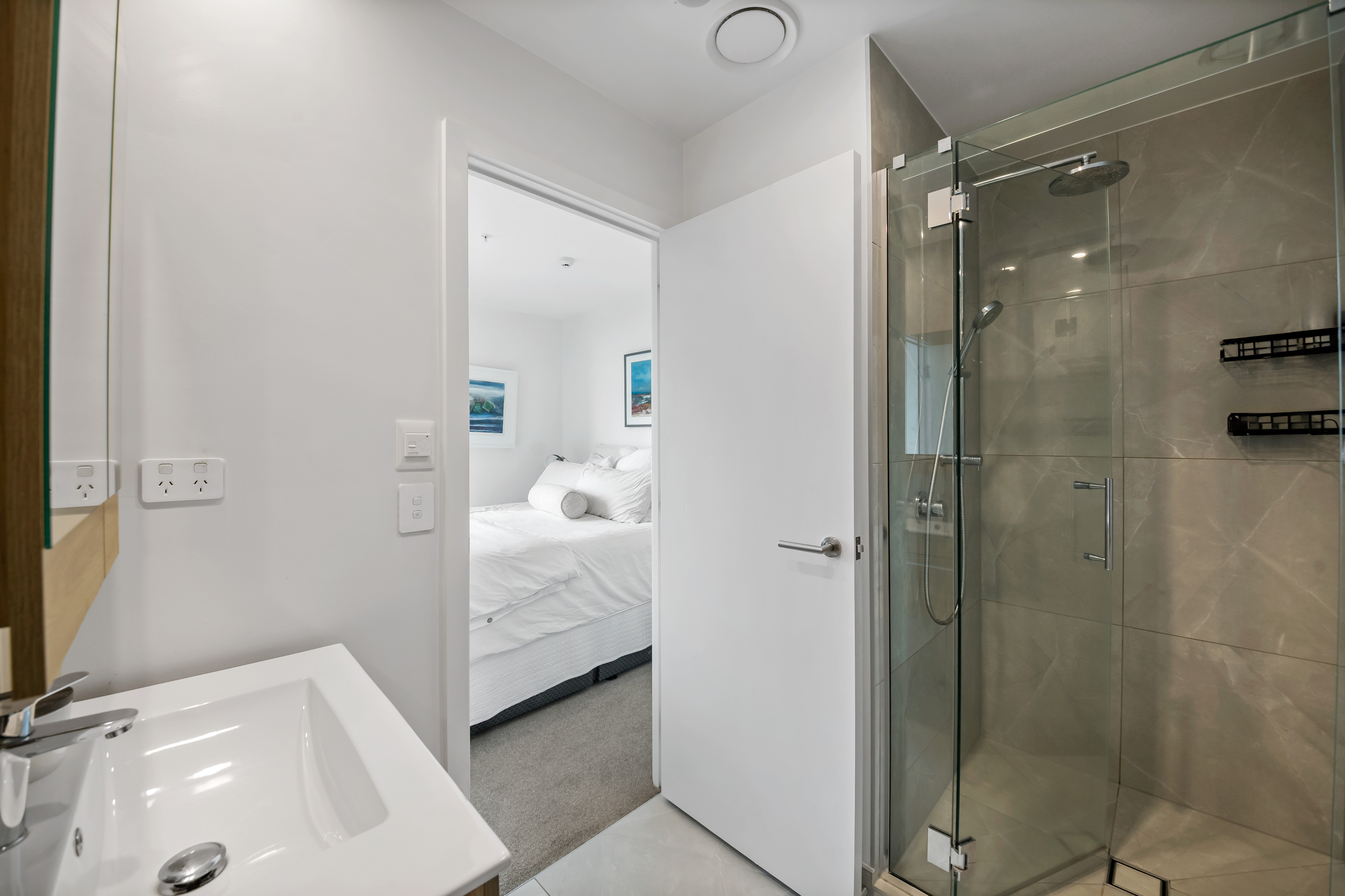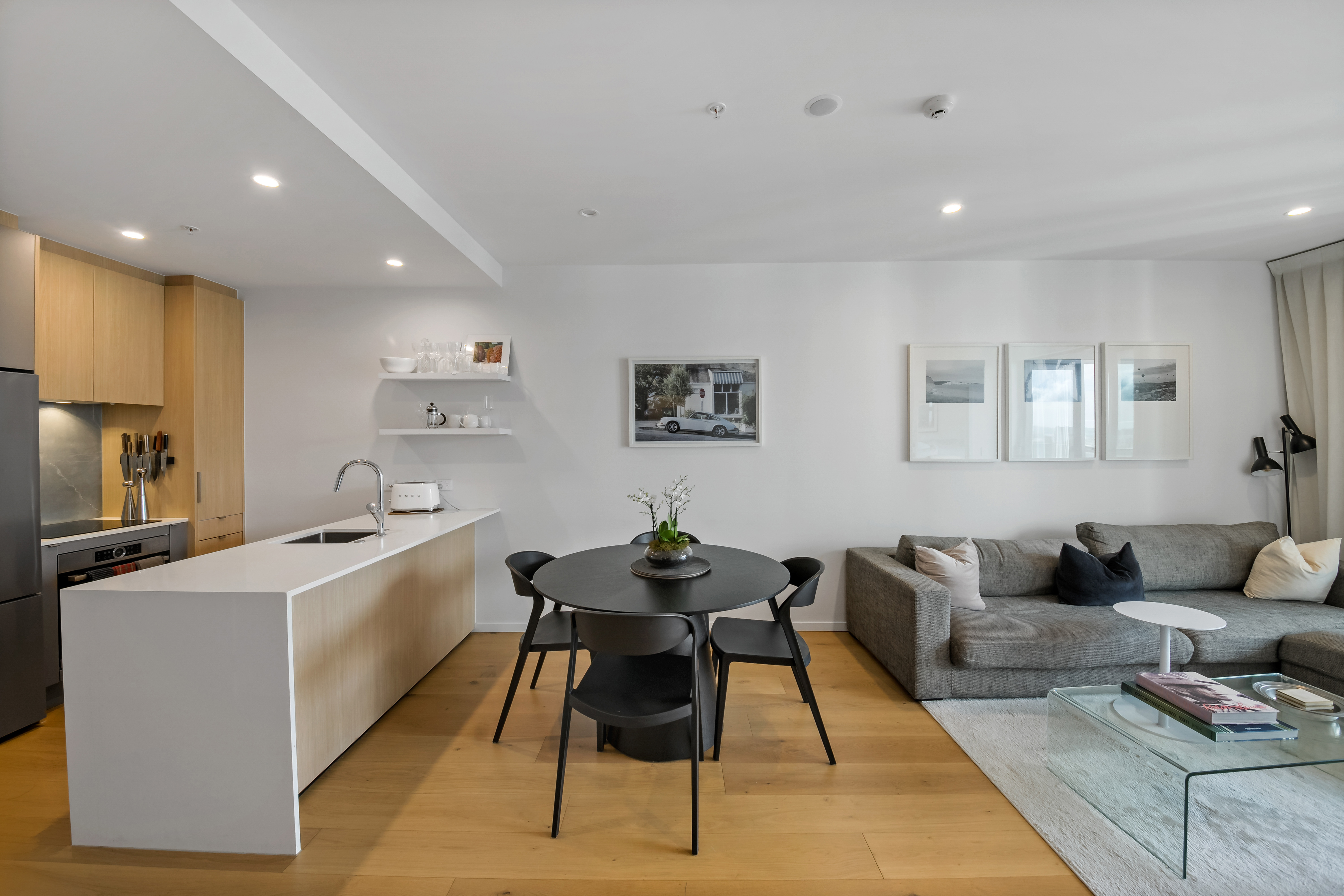 This sophisticated top-floor residence offers a seamless blend of luxury and lifestyle, where a meticulous 64 sqm (more or less) floor plan is defined by a remarkable sense of volume. High ceilings and rich timber flooring lead you naturally toward a 6 sqm covered balcony, a vantage point that treats you to unobstructed views of Rangitoto-an iconic backdrop that transforms beautifully with the light of the day.