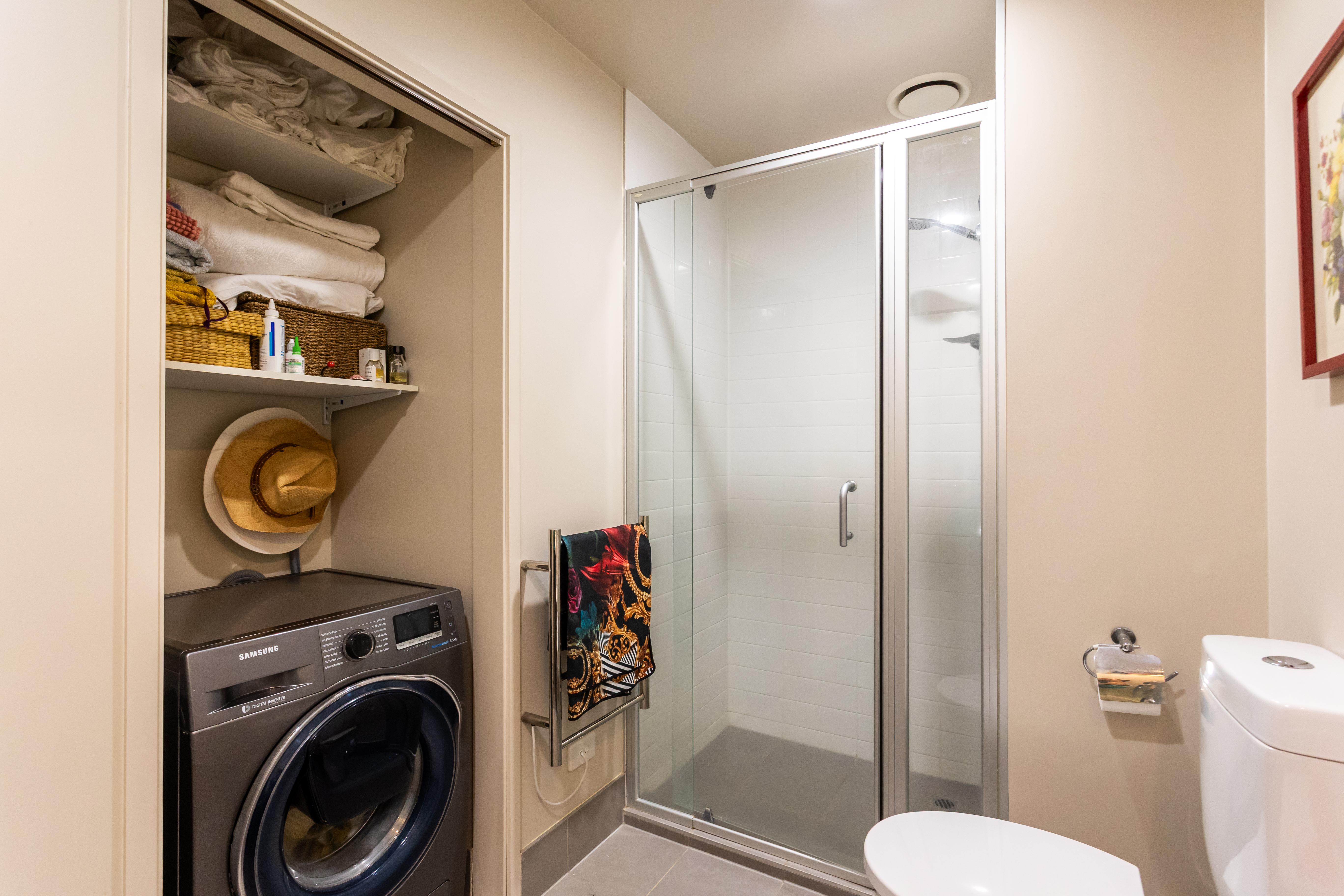Off the hall, and separate from the main living space, you'll find a double bedroom with a built-in double wardrobe and a well-appointed bathroom that includes laundry facilities.