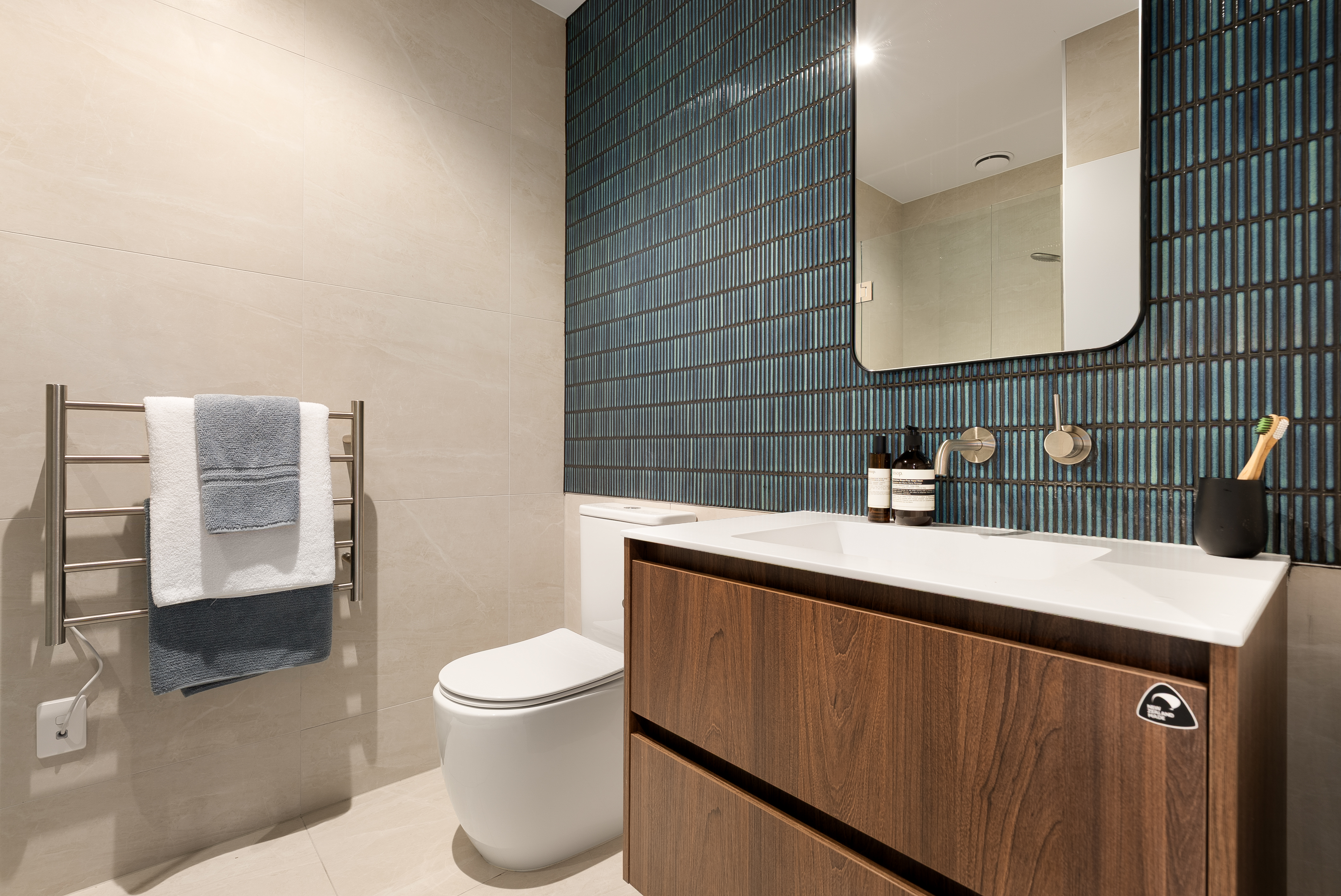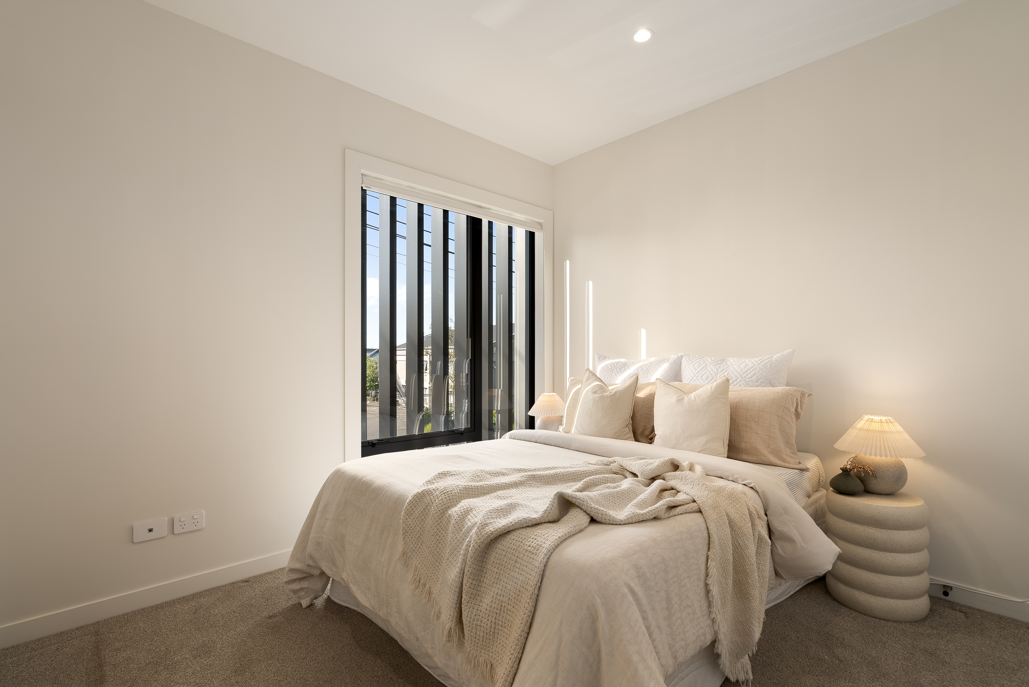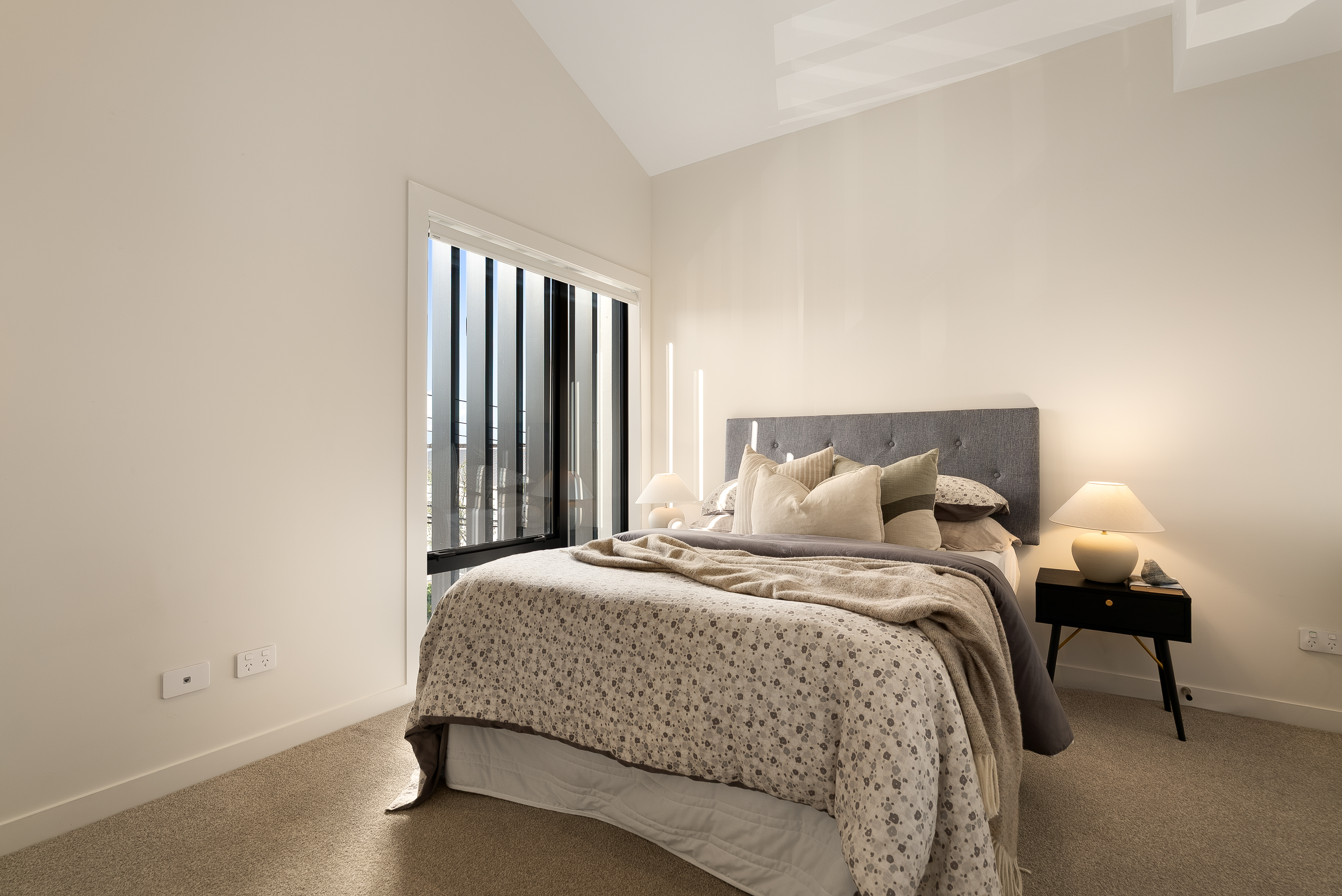 The top floor hosts the private primary suite, featuring a spacious bedroom, a generous built-in wardrobe, and a stylish tiled ensuite. A second bedroom on this level offers further accommodation for family, flatmates, or visitors, each enjoying excellent natural light and separation from the main living zones.