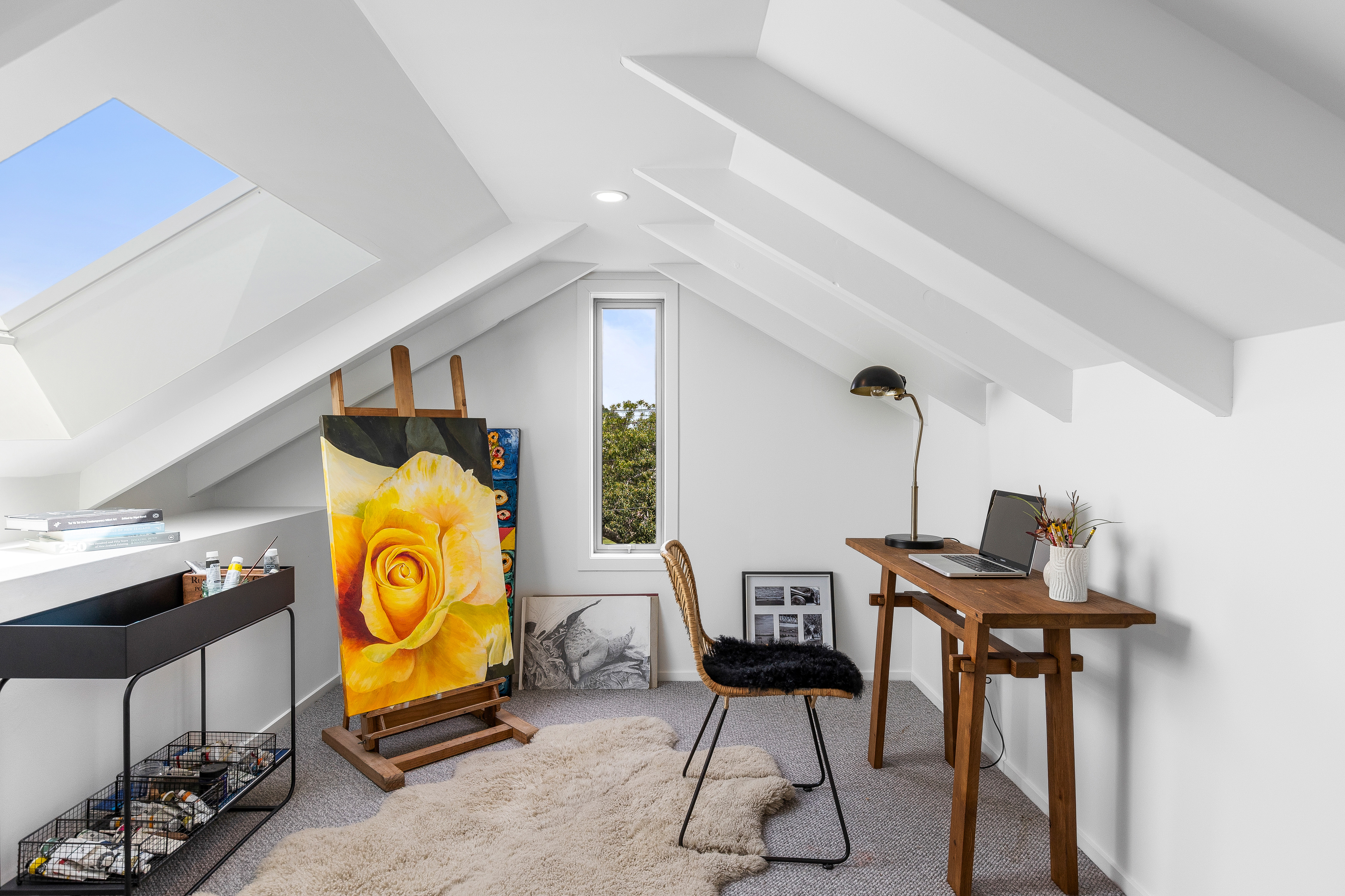 The accommodation is intelligently configured for privacy and versatility. The master suite offers a serene upstairs retreat, while the third-level attic provides a flexible space for a dedicated studio, home office, or children's playroom-all while capturing a perfectly framed view of the downtown city skyline. Outside, the property is complemented by manicured gardens, internal-access double garaging, and the rare addition of a dedicated third carpark or boat parking bay.