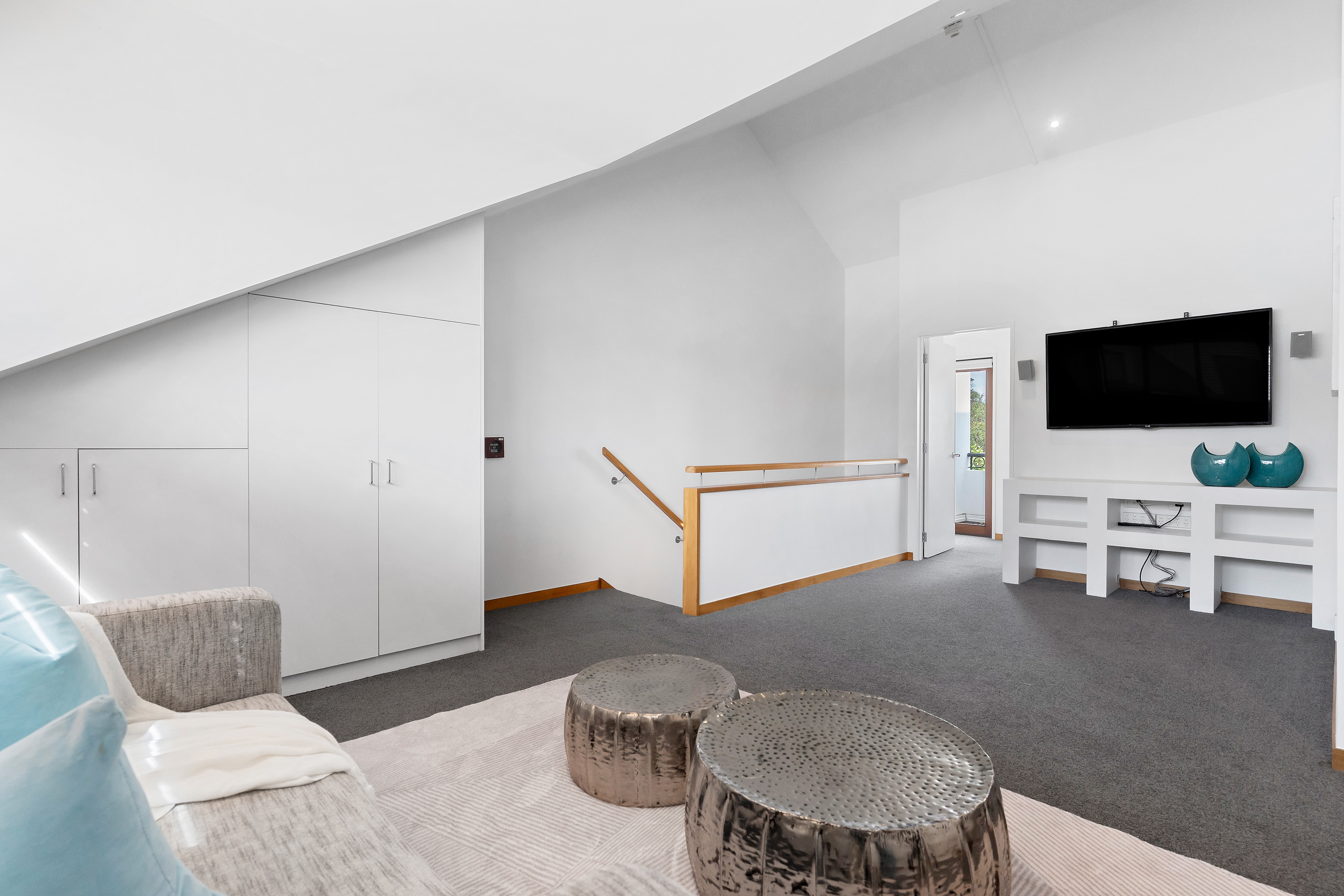 Upstairs, two double bedrooms include the west facing master with its own balcony and tiled ensuite, while the second bedroom is served by a stylish family bathroom with bath and shower. The top floor adds versatility with a spacious lounge, media or office space, plus a third bedroom enjoying long westerly views.