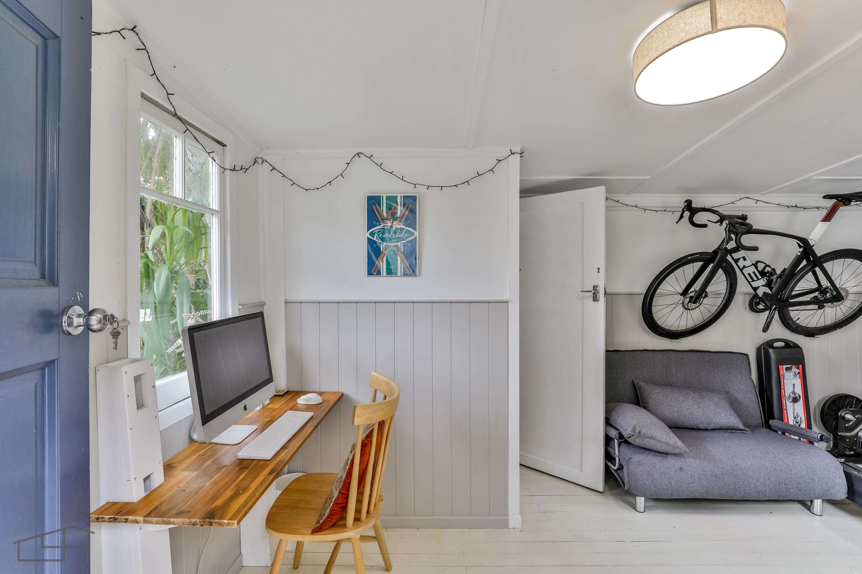 Outdoors, the elevated rear garden offers a serene extension of living with plenty of space for a vegetable plot, play space for children, or simply a quiet seat in the sun. A detached sleepout with a second toilet provides useful flexibility for creative or practical pursuits.