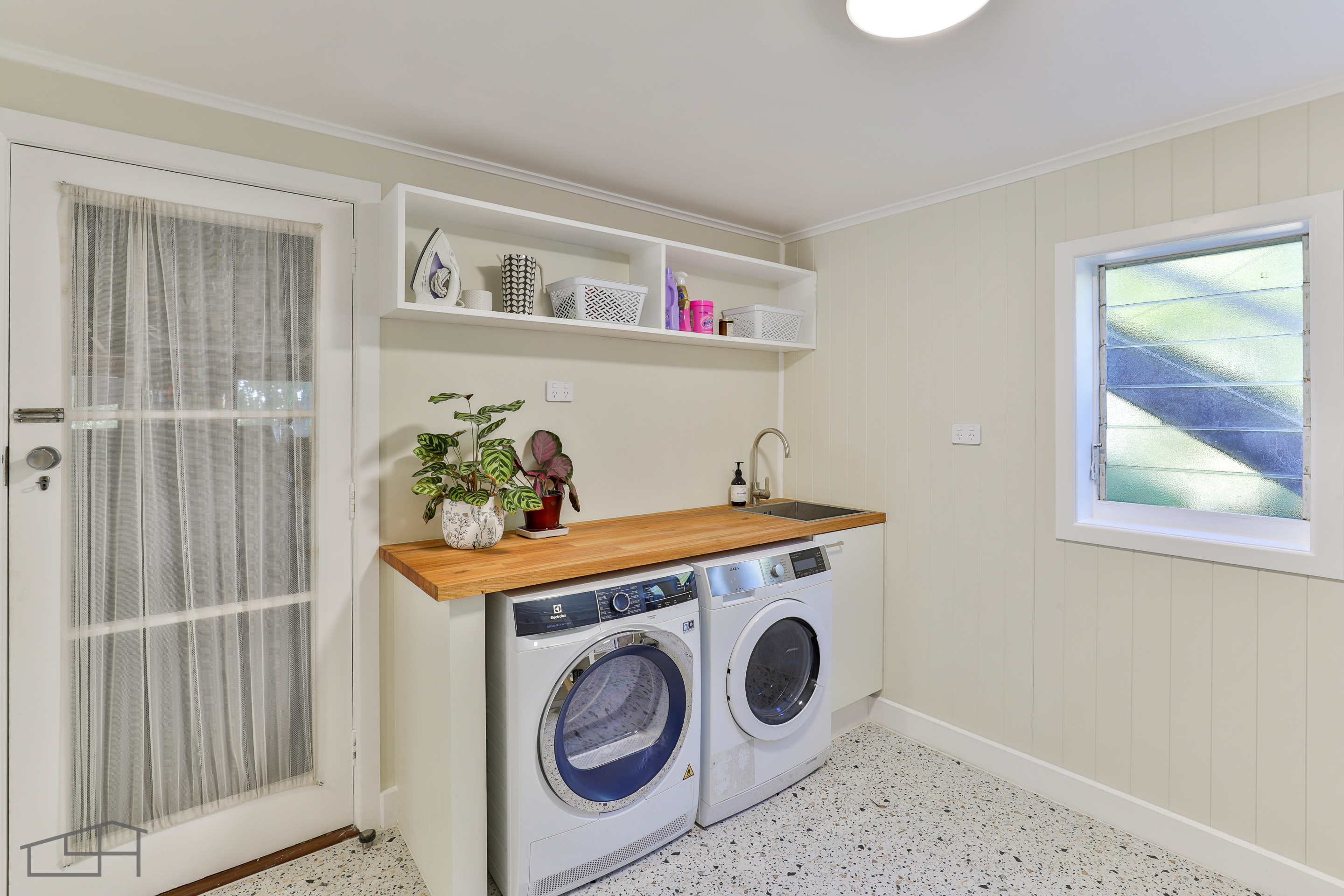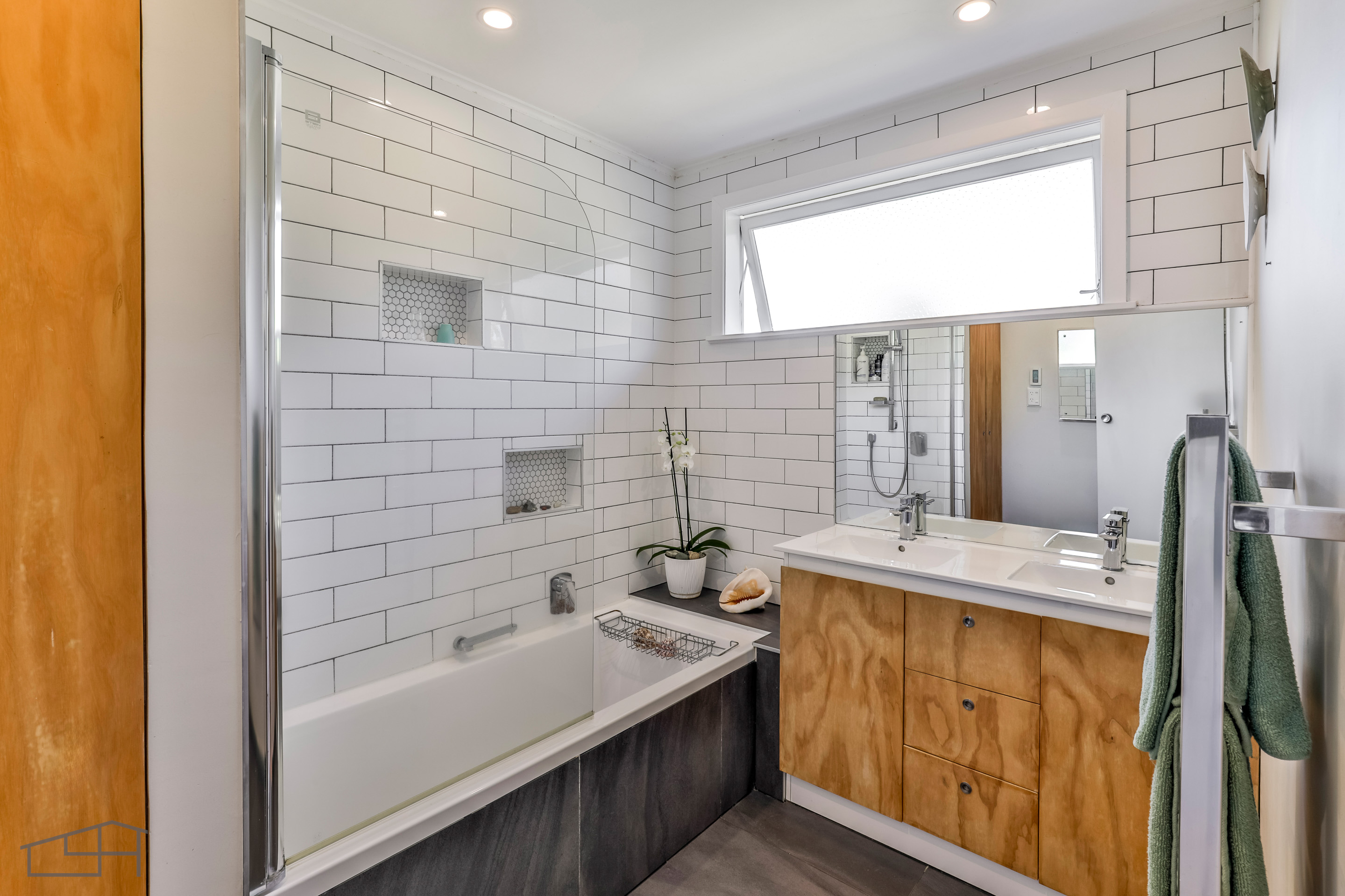 Modern touches continue into the main bathroom, updated with warm plywood cabinetry and white subway tiles incorporated into the shower over bath. Practicality is a priority, with a generous upgraded laundry room and a large double garage with internal access.