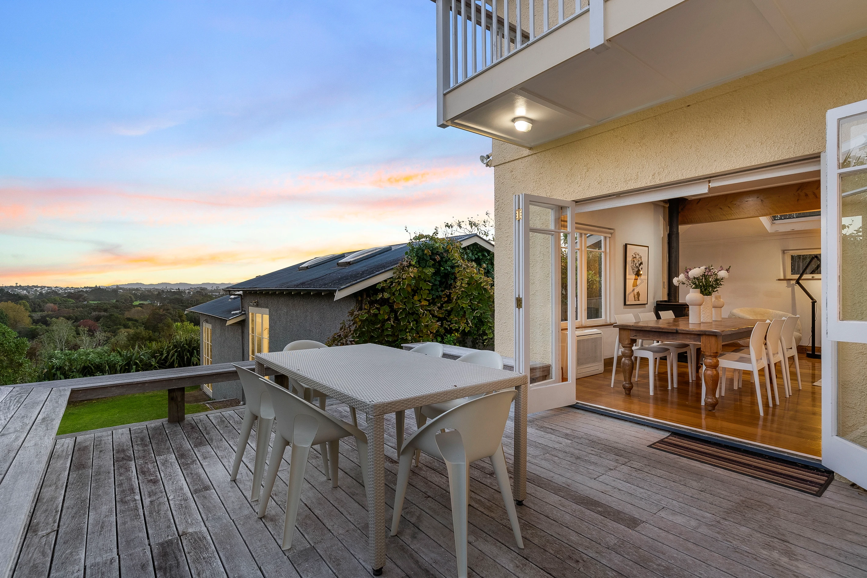 The open-plan living and dining area flows out to a deck and garden with views of Western Springs Lake and spectacular sunsets. The large kitchen includes two walk-in pantries, which could be converted into a scullery.