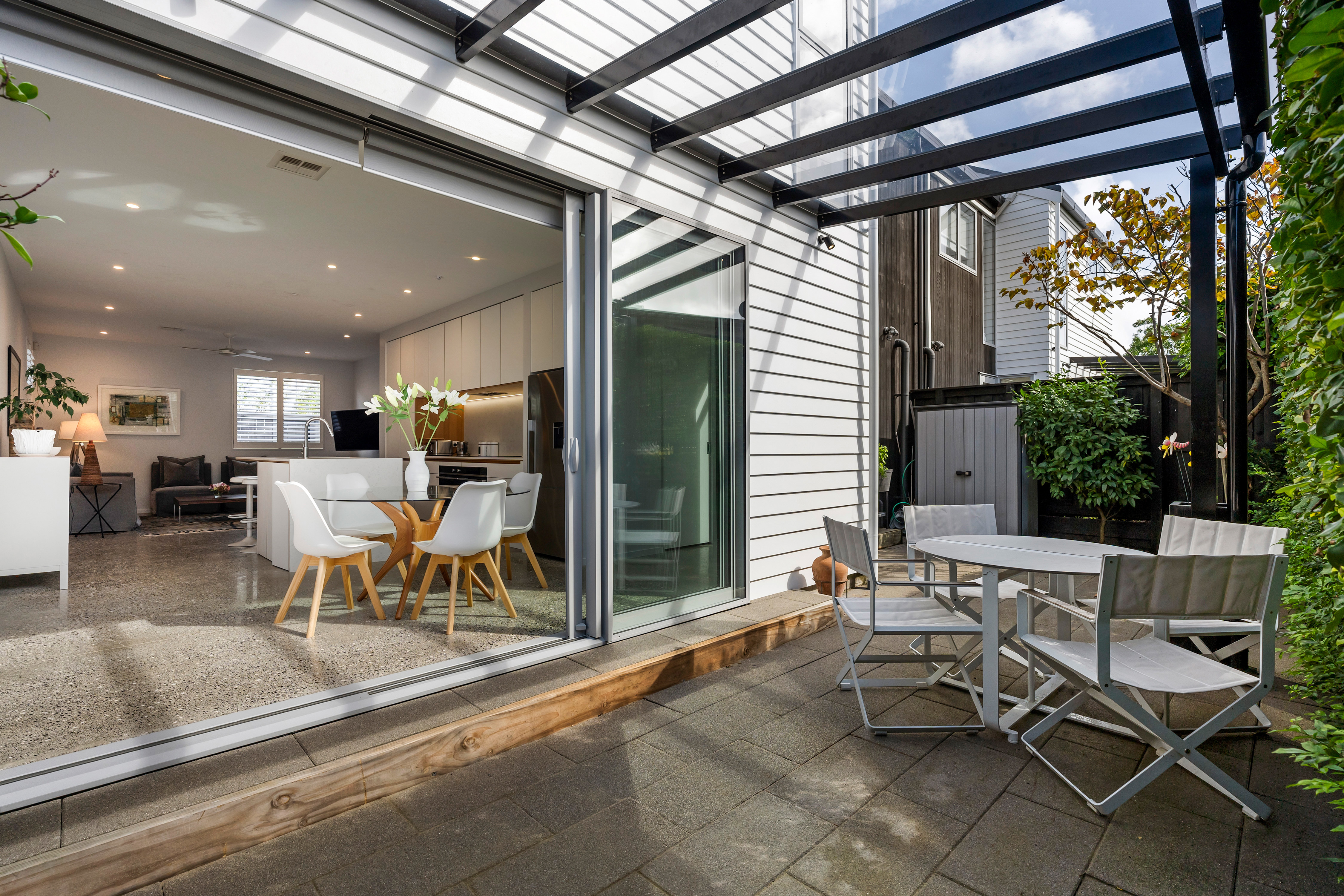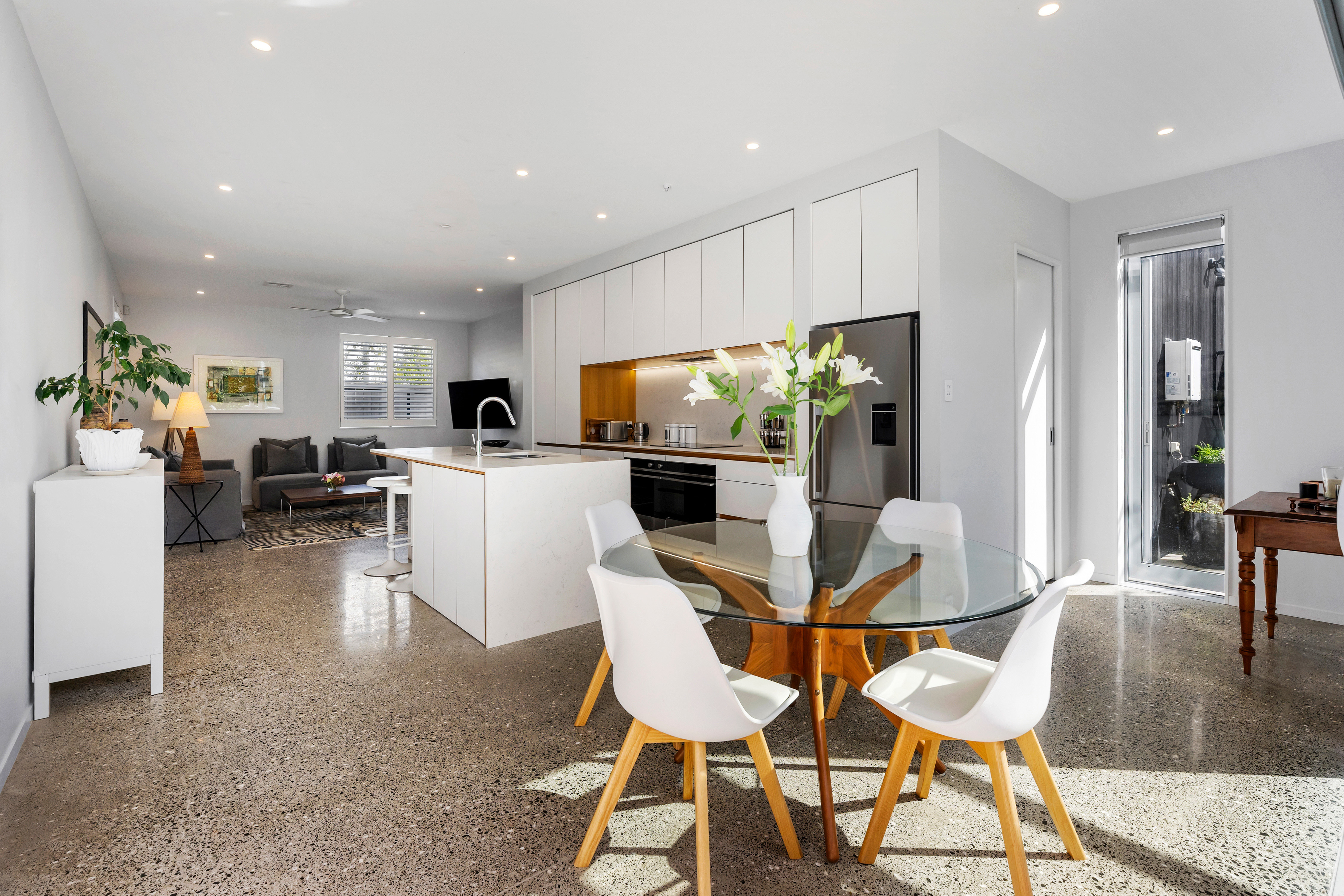 Downstairs, the chic open-plan living, dining and kitchen area forms the heart of the home, flowing seamlessly to a sun-soaked patio that captures all-day light. Whether it's morning coffee or evening entertaining, this is a space that feels easy and relaxed. A powder room and internal-access garage complete the lower level.