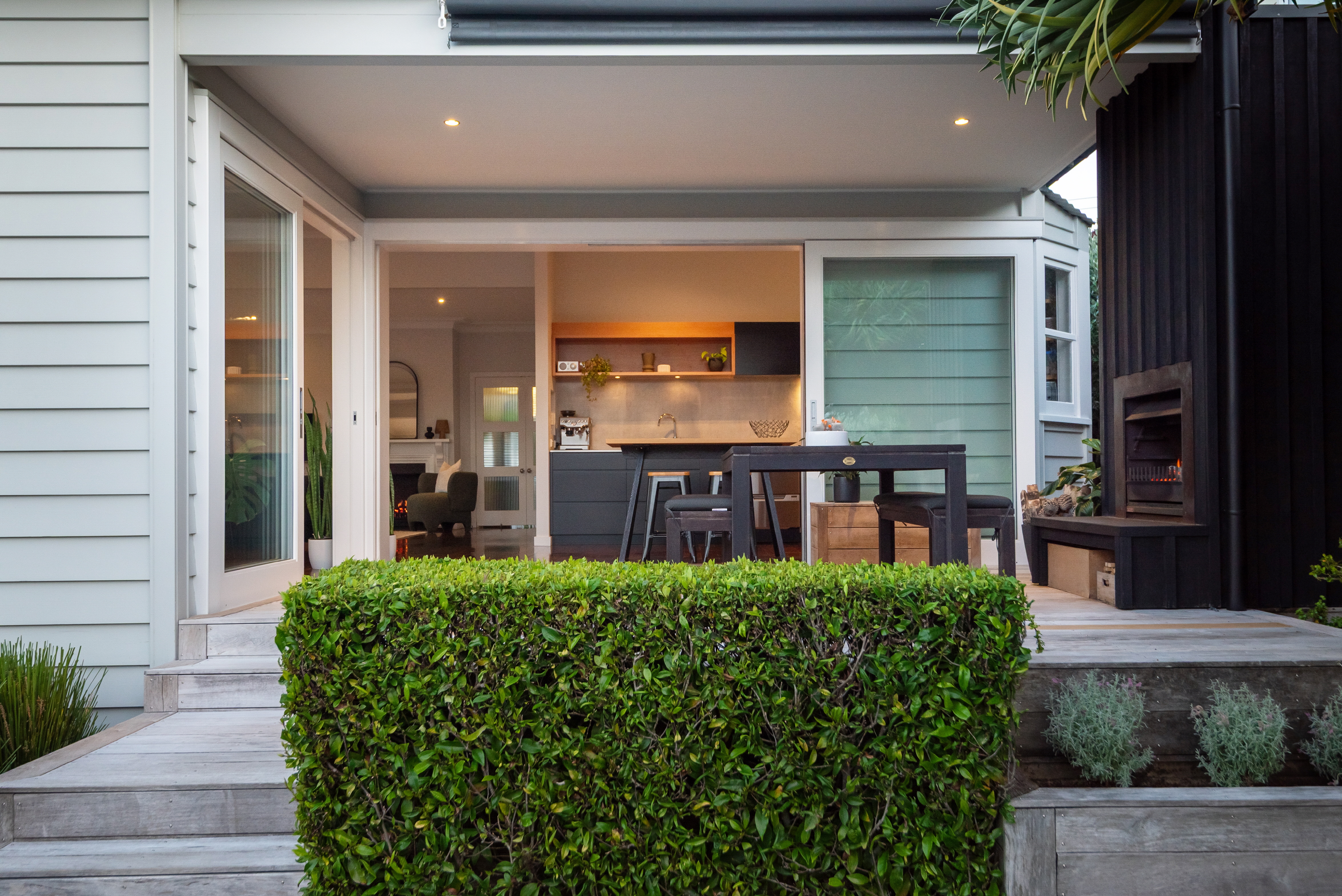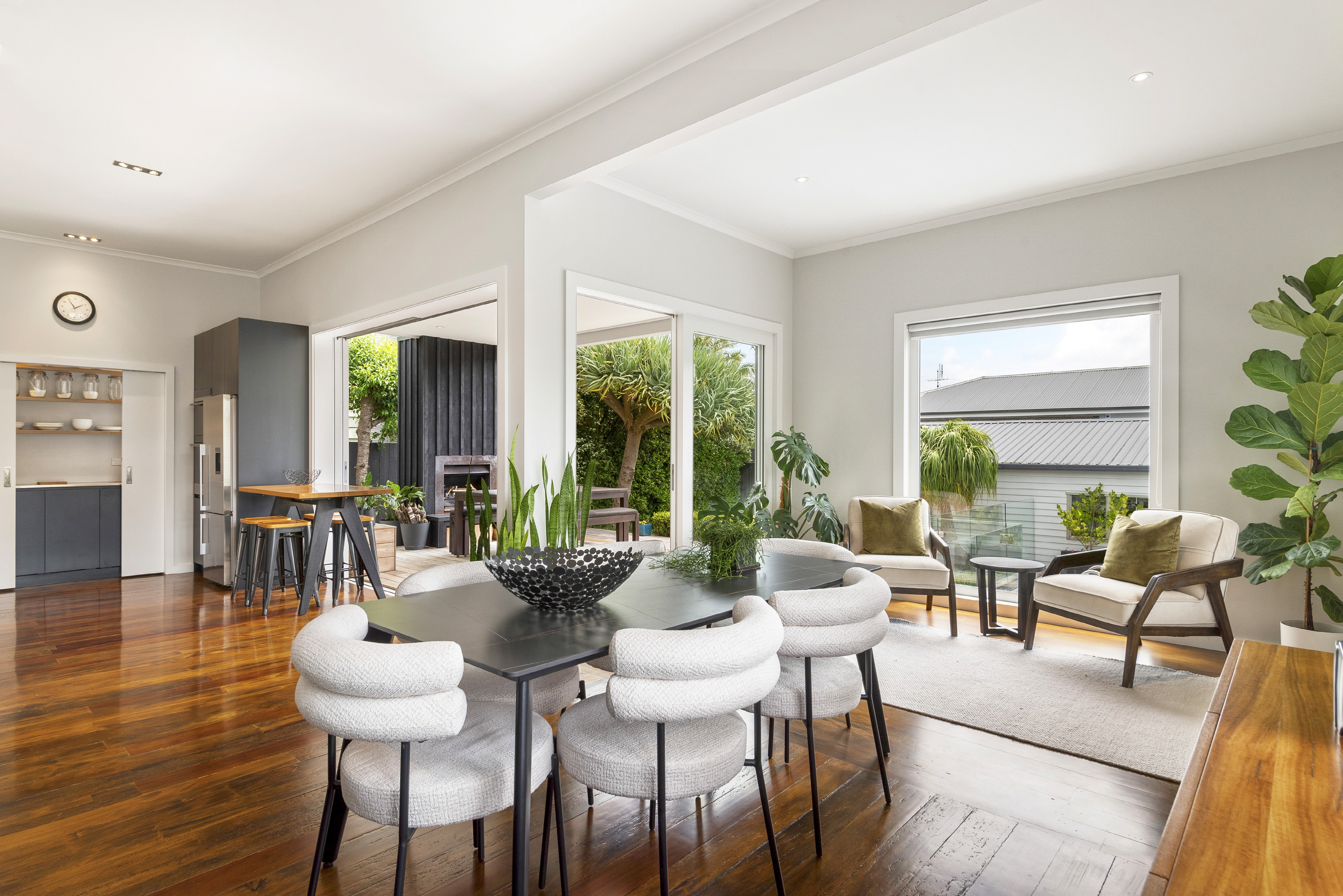Open-plan living, dining, and kitchen areas flow seamlessly to a sheltered alfresco zone, where the shimmering pool takes centre stage and a cozy outdoor fireplace sets the scene for year-round entertaining. The sleek kitchen, with natural timber accents, and premium appliances, connects effortlessly to the outdoors, making it the heart of the home.